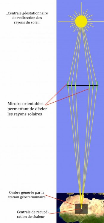 Bonjour Neikster, Je reviens sur votre remarque concernant l'occultation du soleil au-dessus du Sahara. 1°/ Cette occultation du soleil sera en très grande partie diffusée par l'énorme surface d'émission du soleil, cela veut dire que les rayons d'icelui se croiseront sous la surface occultante, si bien que le bénéfice d'ombrage sera dilué du centre vers son entourage. 2°/ Je ne pense pas que cela engendrera plus de perturbations qu'en auraient des nuages noirs. Cordialement, Christophe Verna -